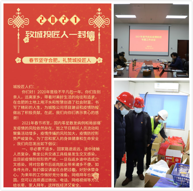 城投公司为广大建设者精心准备《致城投匠人一封信》,通过公司微信公众号、现场宣传等方式广泛宣传,号召城投匠人们非必要不返乡、返乡前按要求报备、如需返乡途中重防护、春节返岗服管控,网络拜年也是团圆,尽量留在合肥过年,休整身心迎接来年工作。